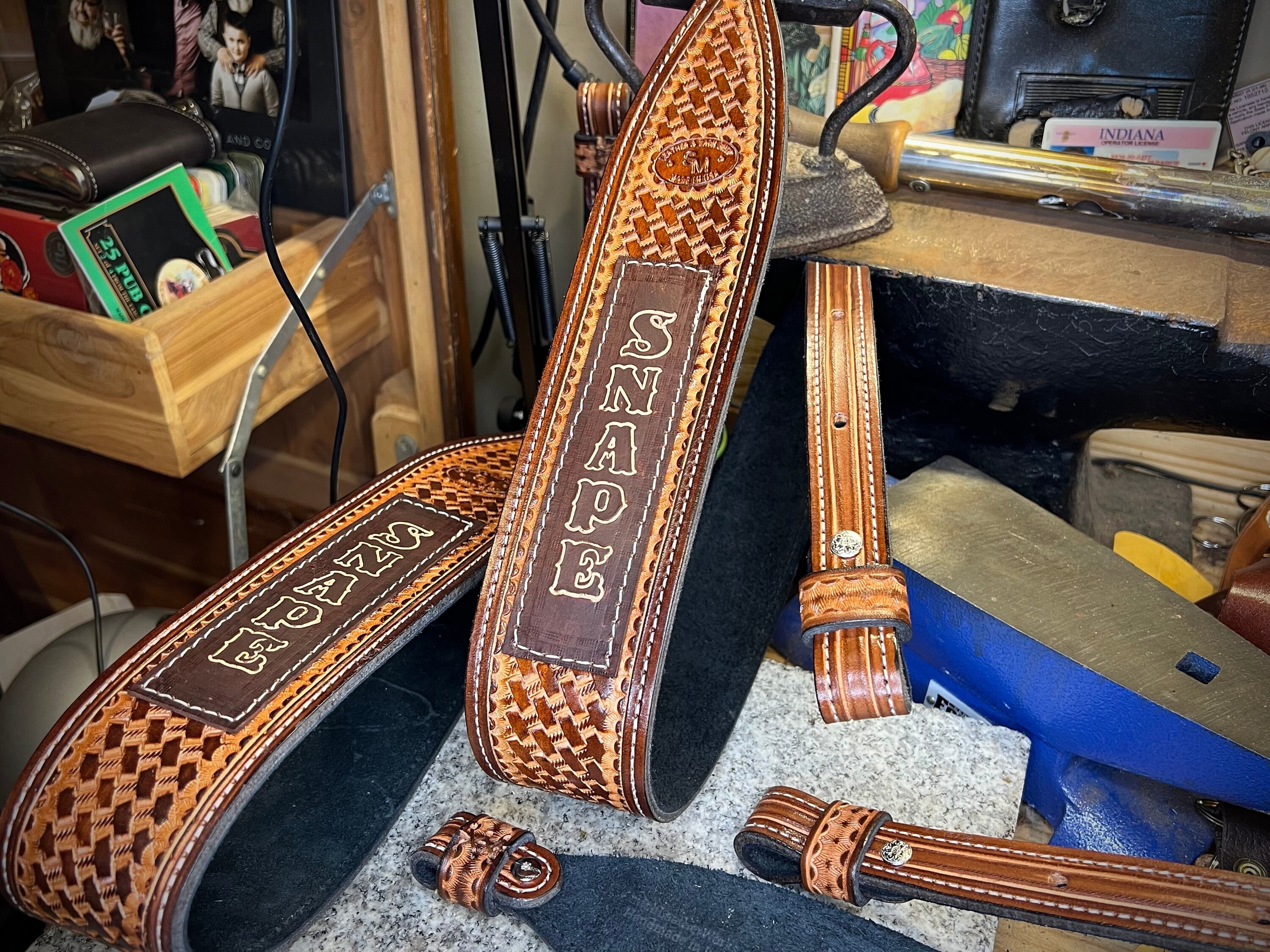 Full grain leather strap. Hand cut from natural hides. Hand tooling basket weave.