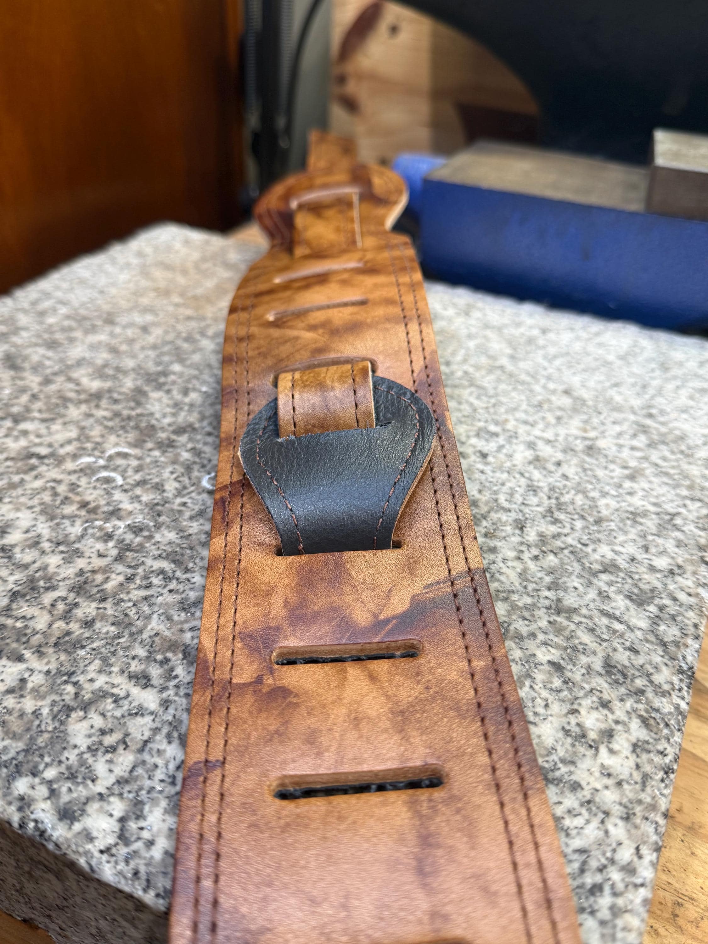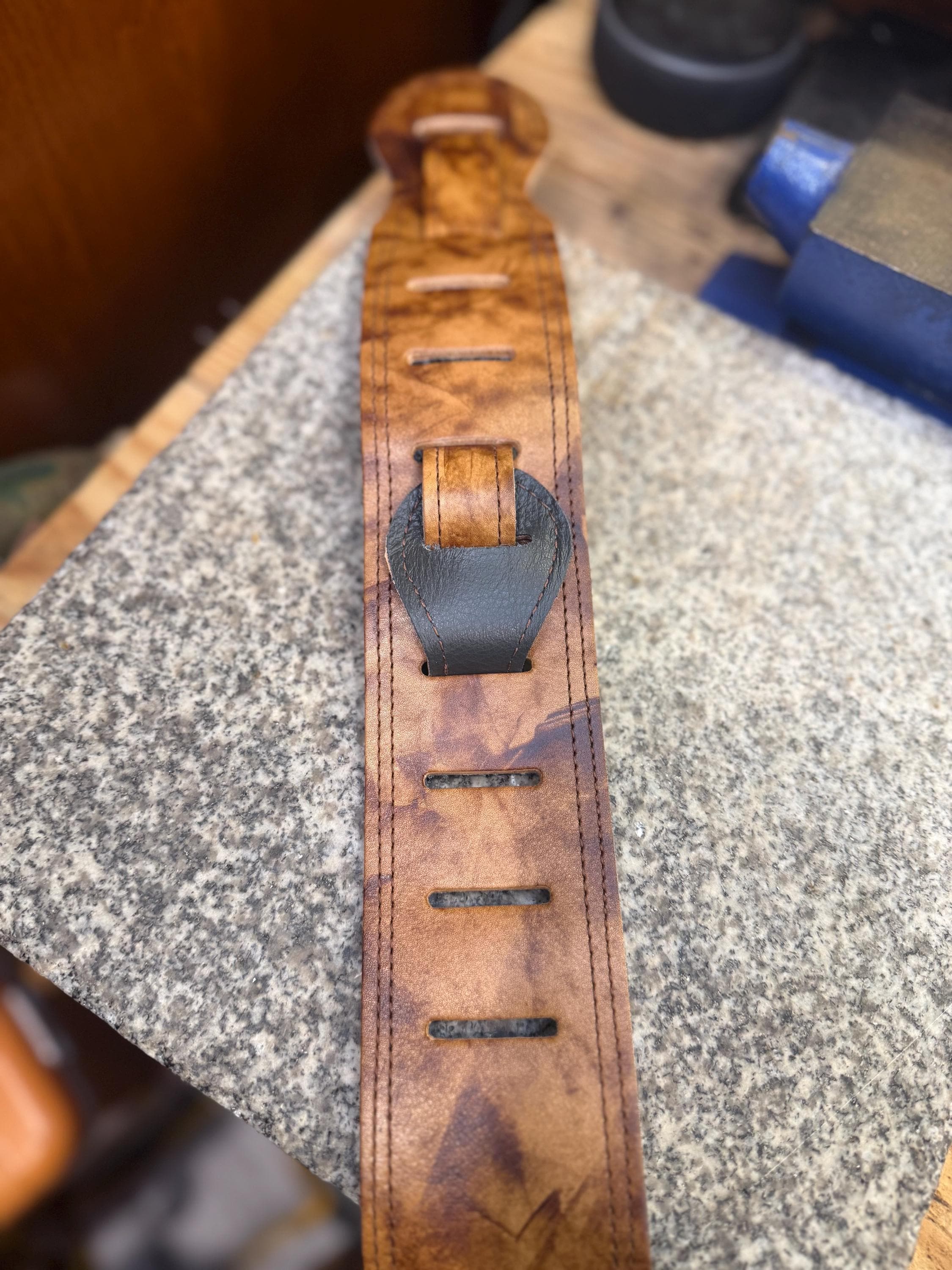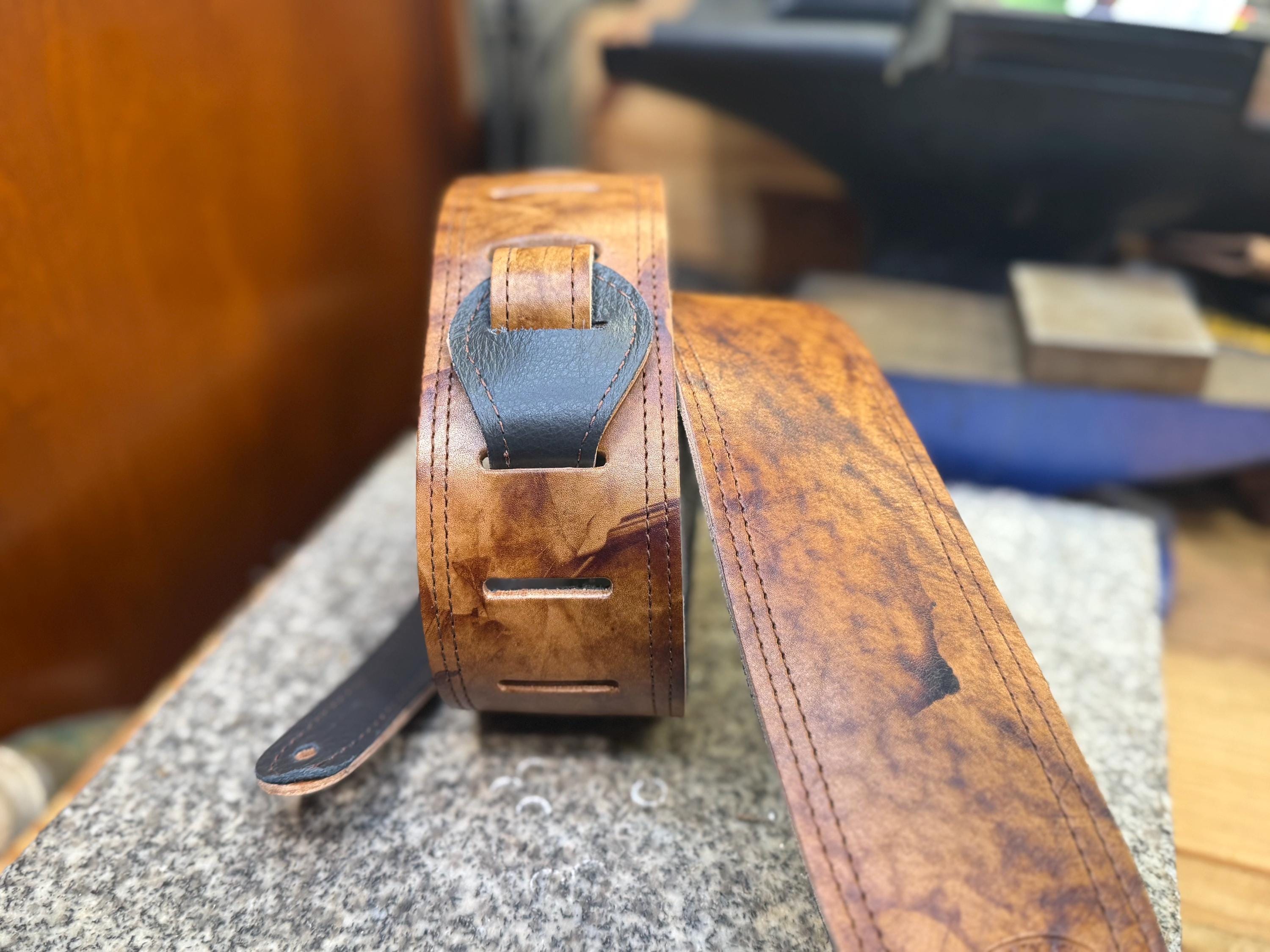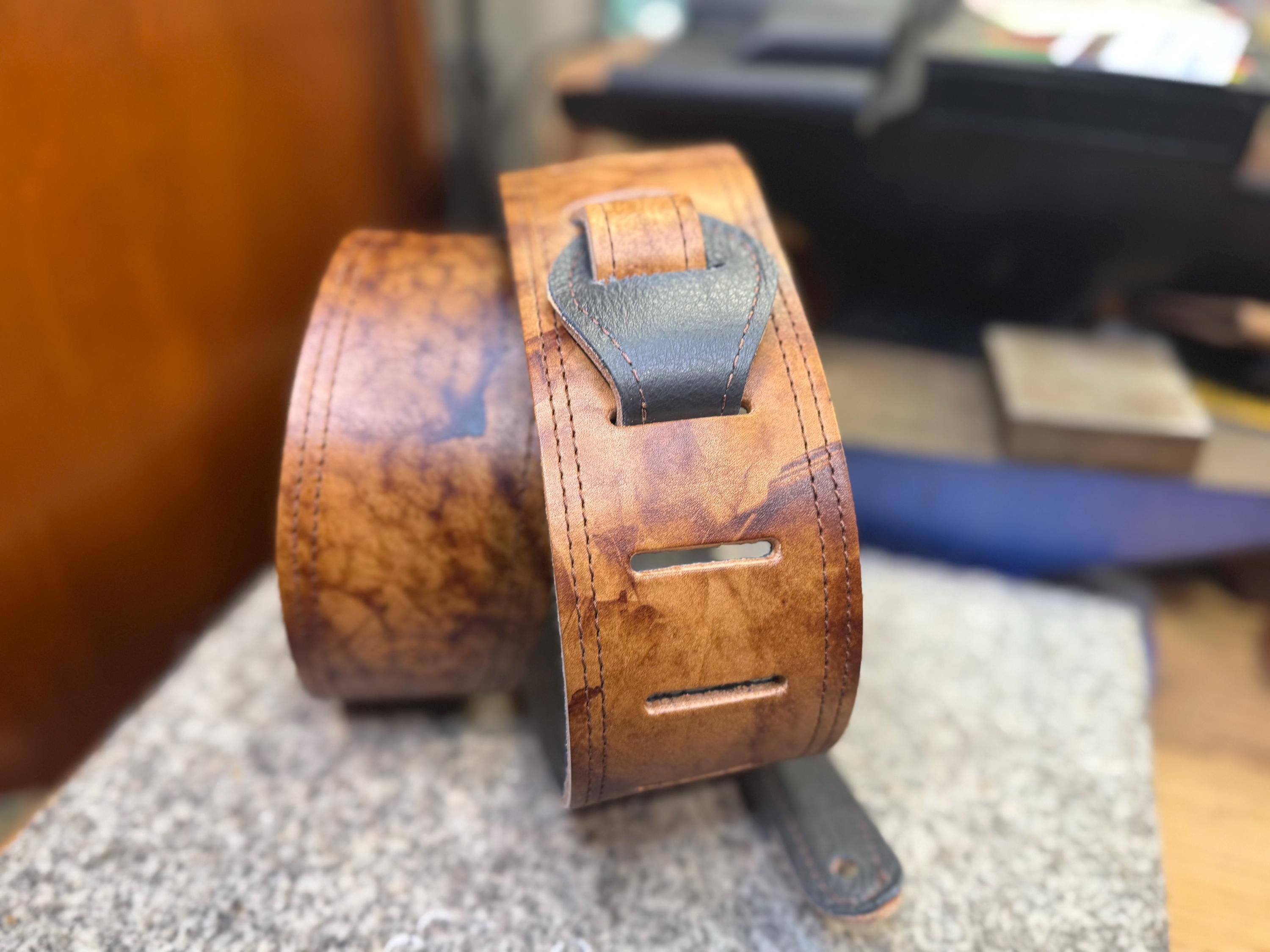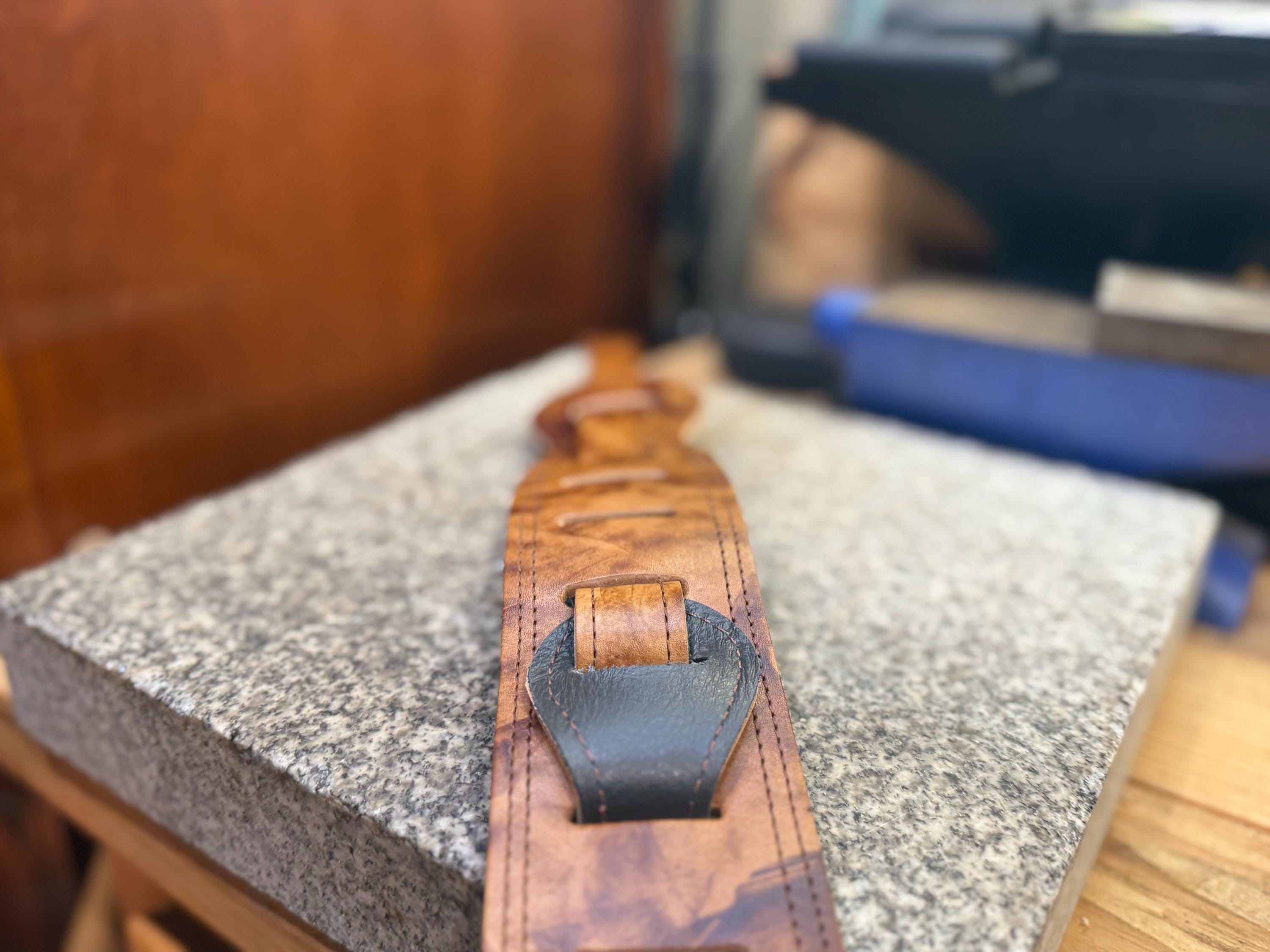 This calf leather is new old stock, when it's gone, it's gone. It's a vintage full grain calf leather guitar strap that’s American made by hand. Hand cut. Motion stitched. An heirloom quality strap that will be passed down to the next generation of musicians.