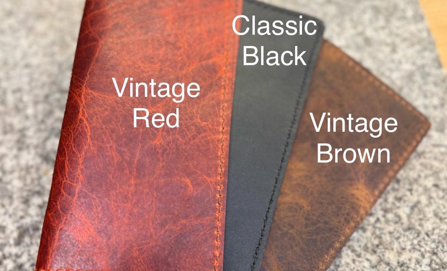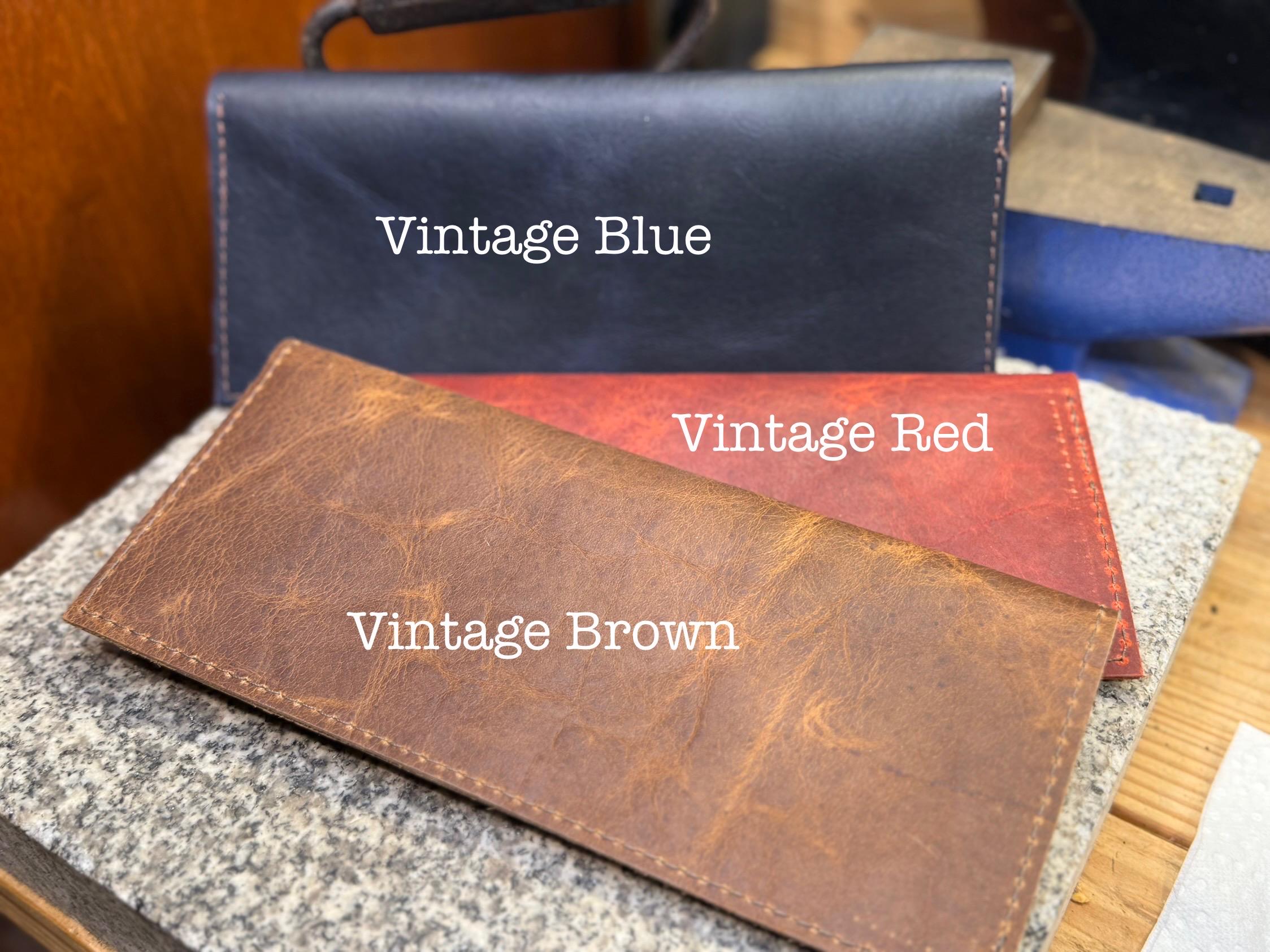 The vintage brown, vintage red and vintage blue are American bison leather, and the classic black is cowhide. The brown, red and blue have a pull-up vintage finish while the black has a smooth sheen to its finish.