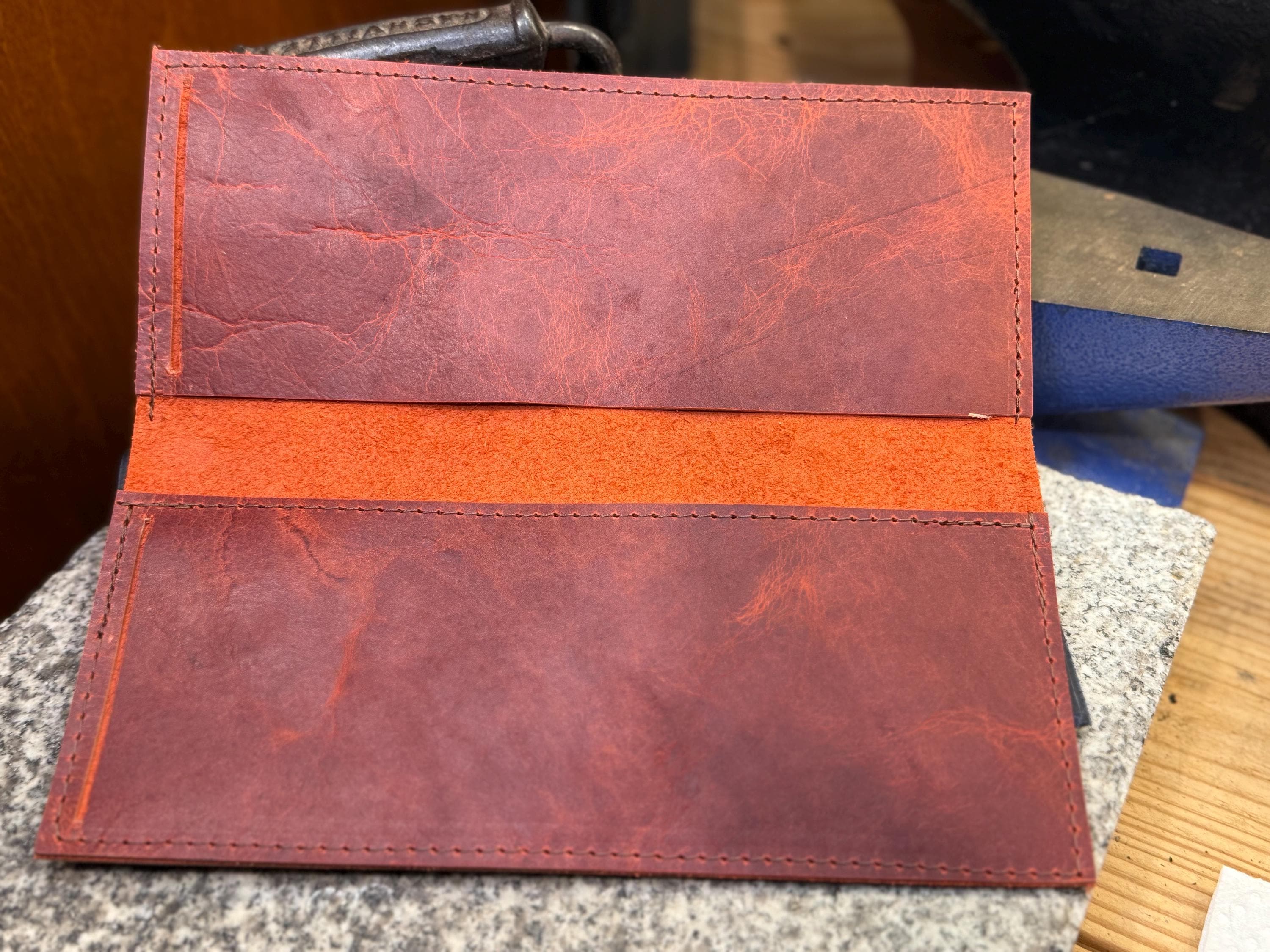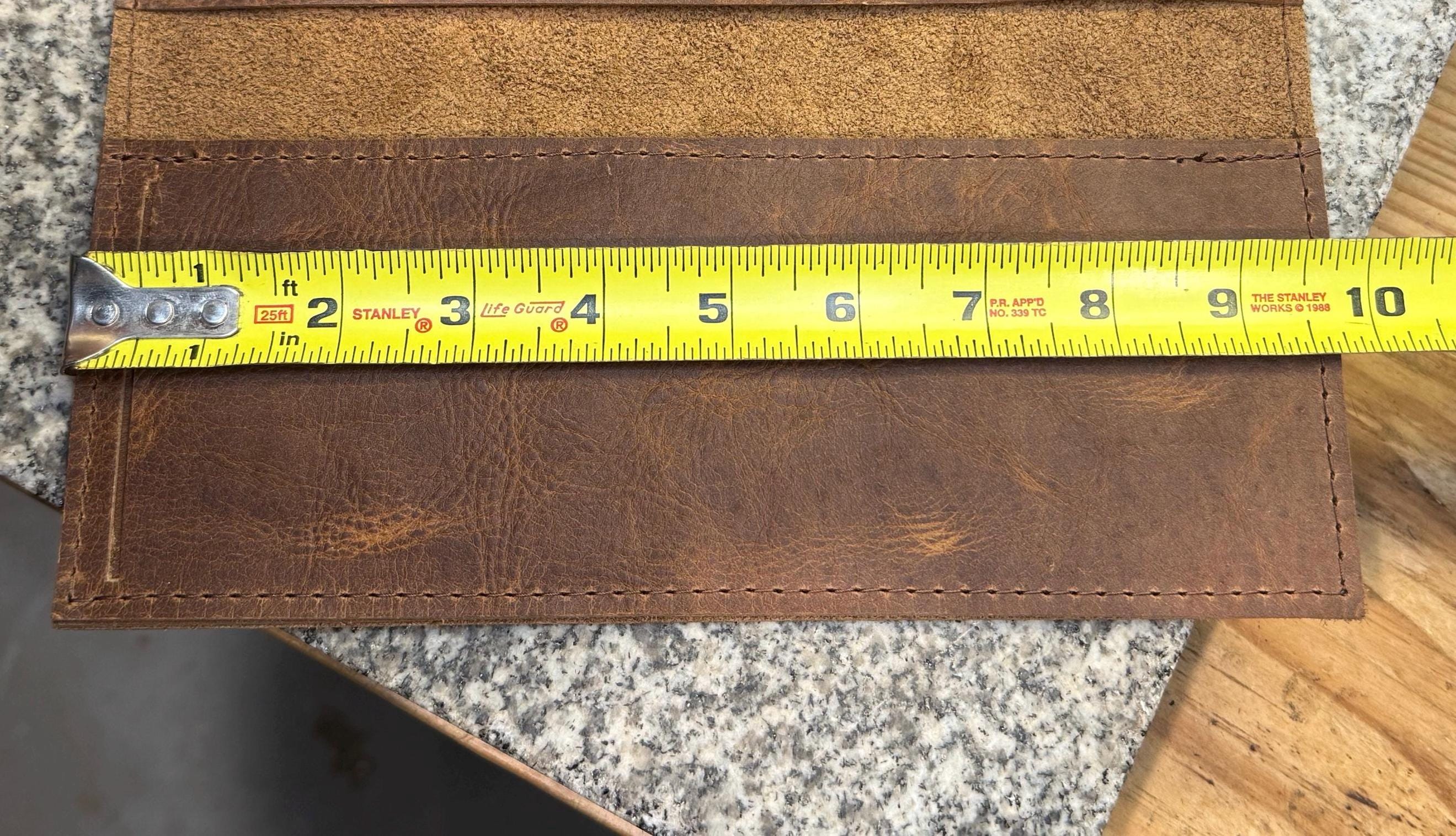 This checkbook cover is handmade from full grain leather. It has a classic look and will be durable for years of use. It's made to use with business size checks.