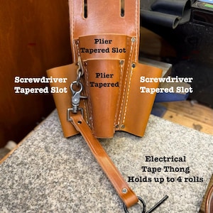 We make these holders from durable full grain hides of English bridle leather. Hand cut and foot press riveted. Slides onto your work belt.